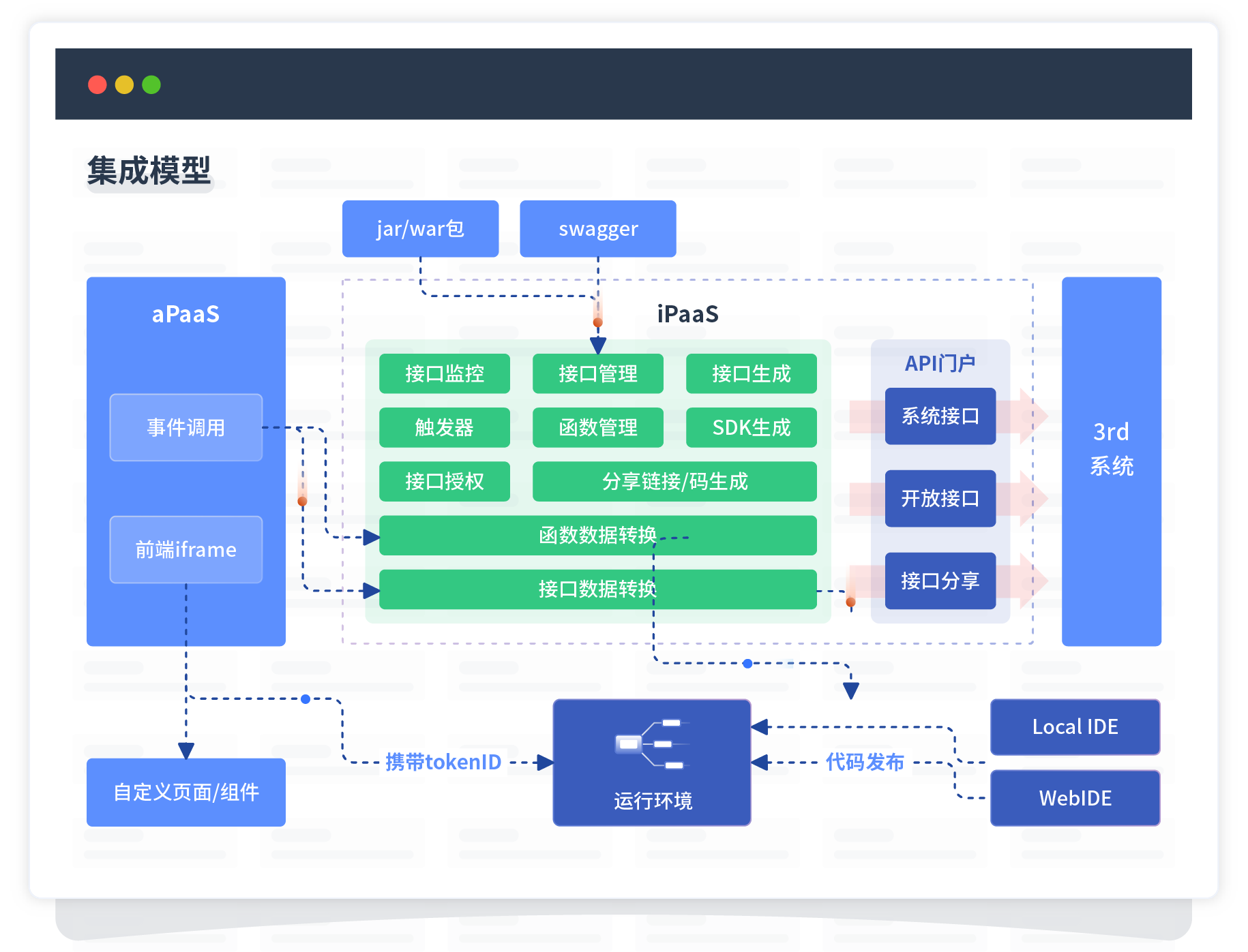 集成模型包括平台本身前、、、后端能力的扩展,,,,也支持通过API门户和第三方系统进行交互。。。。