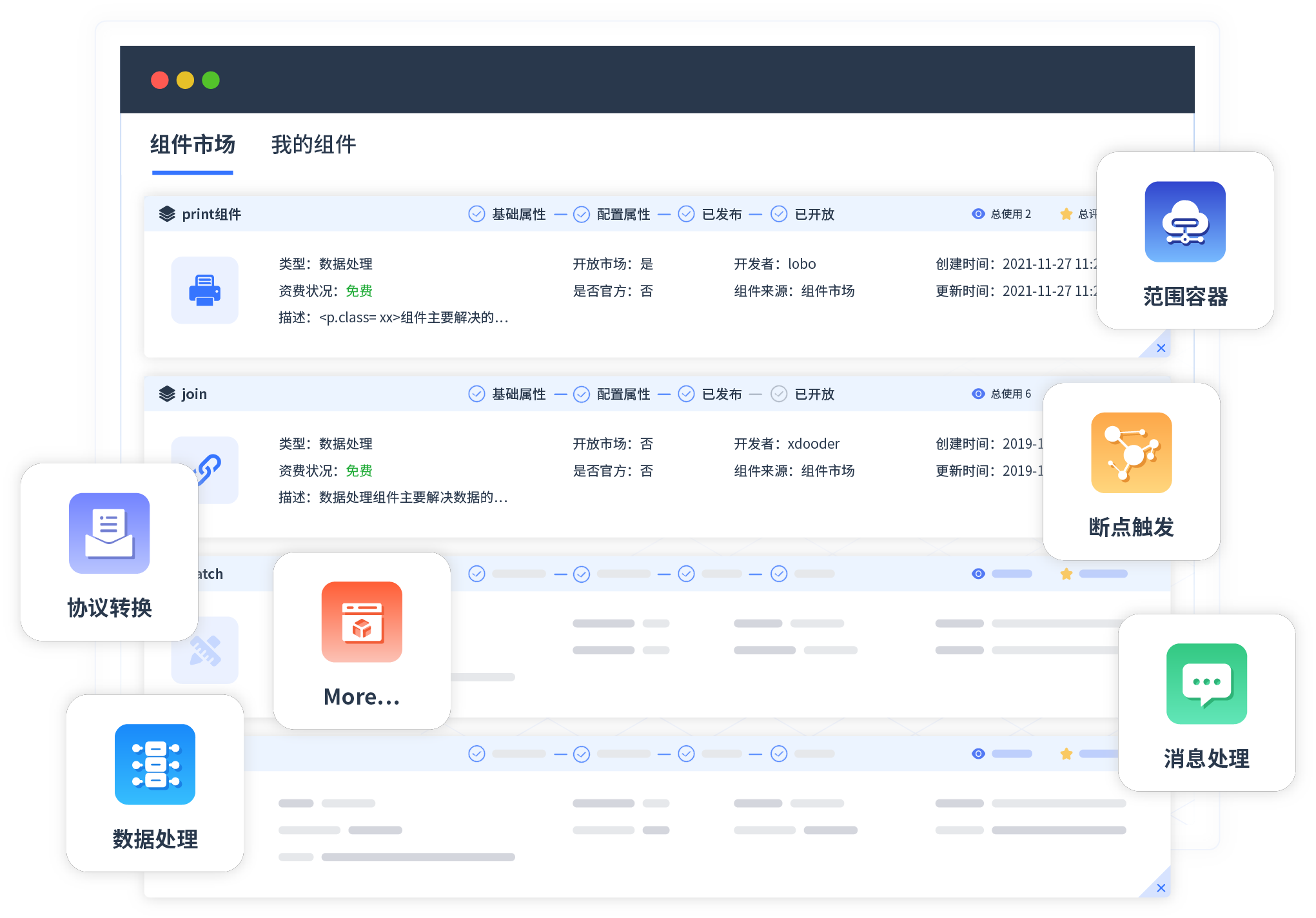 针对集成场景,,,,GOPAY钱包提供组件市场,,,例如协议转换、、、消息处理、、文件操作等。。。除平台提供的组件外,,,客户可以自定义所需组件。。。。