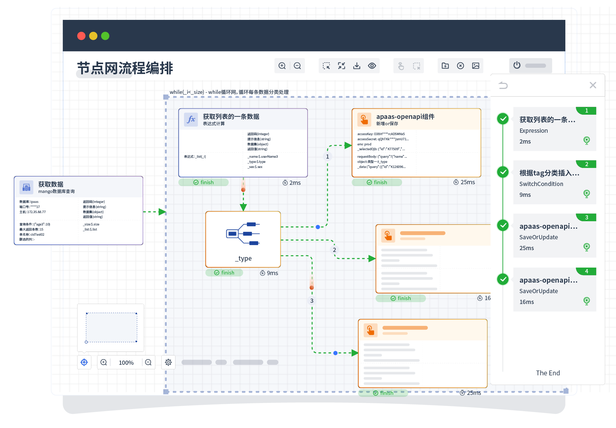 针对集成场景,,,组件定义后支持进行流程编制,,,不同于传统代码方式,,,通过图形化展示,,,,支持在线调试、、日志查看和运行回放。。。